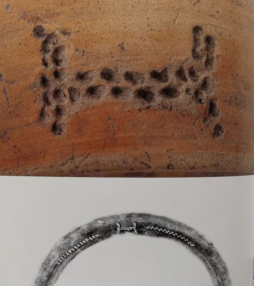 闻氏几十年前收集的良渚古陶瓷上刻有古文字,经整理研究将5300年前良渚陶文与3300年甲骨文进行比对,发现良渚陶器上刻写类甲骨文造字结构180余个,例如:田、目、日、井、人、入、工、王、爻、卜等造字结构距今已5300年一承不变,与汉字一样;有的高度相似于甲骨文,如封、谷、戈、戊、聿、牛等;另有一些近似甲骨文造字结构,笔划已超过九画,比字母造字结构的三画,难度更大。